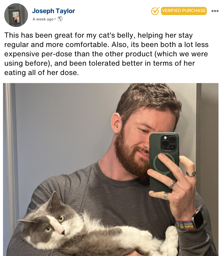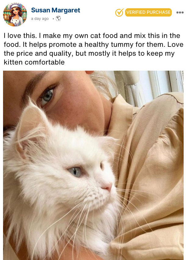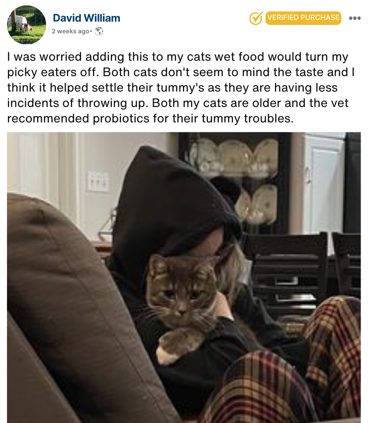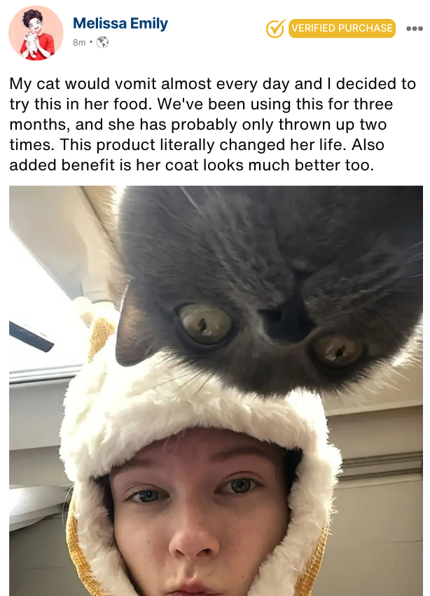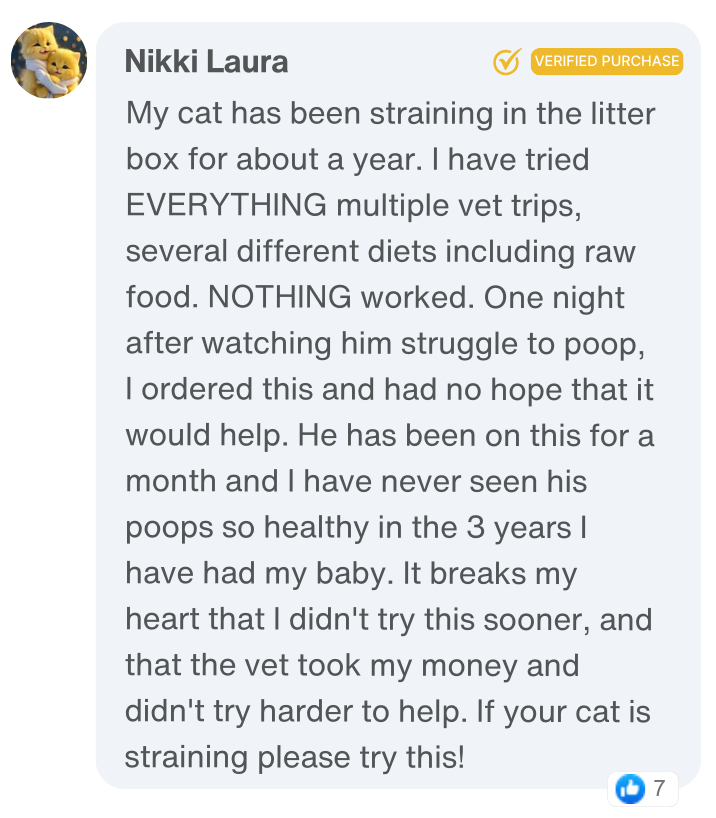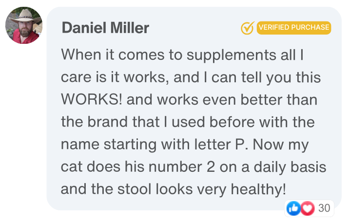 "These helped my cat sooo much! She was having some digestive issues, our vet recommended these and they have made her so much more regular!"