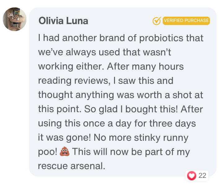 "Long story short when I got her she wasn’t thriving, she couldn’t digest anything and was so so sick, she barely made it. Fortiflora made it worse. My vet said to use feline biome and it’s helped!"