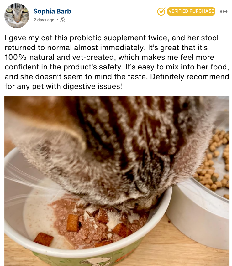 Feline Biome's powder is designed to blend seamlessly with your pet's food, making it easier for you to support their gut health every day. Unlike cat probiotic chews and tablets, our powder formula works subtly during mealtimes, designed to provide comprehensive gut health support.